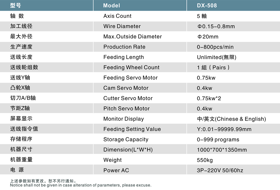 DX-508 is good combination of speed and precision. With Taiwan Controller and Japanese Industrial Servo Motor, it is consisted by one wire feeding axis, one OD axis, two cutter axis, one pitch axis and one mandrel back and forth axis. it increased spring production output while reducing manual operation difficulty and saving product set-up time.